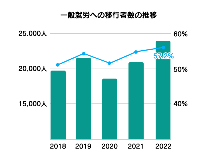 2022年のデータによると、就労支援サービスから一般就労への移行者は前年より増加しており、約2万4千人の方が就労につながっています。
