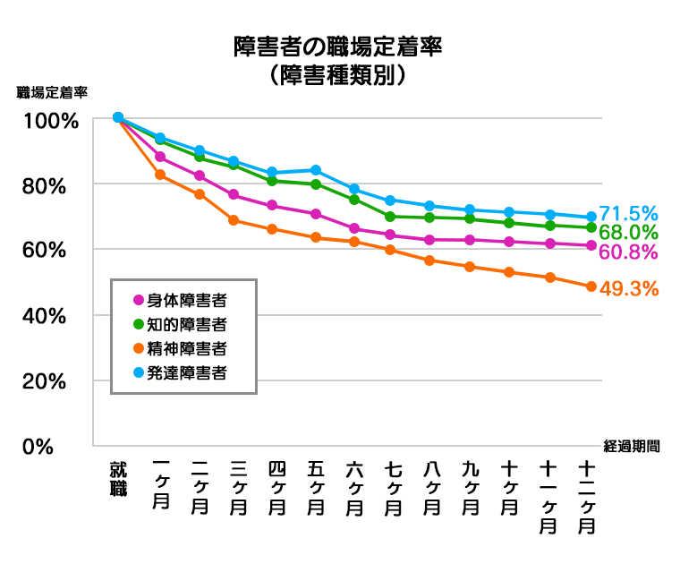 知的障害や発達障害のある方は比較的安定して就労できていますが、精神障害者の定着率は最も低く、働き続けることの困難さが読み取れます。