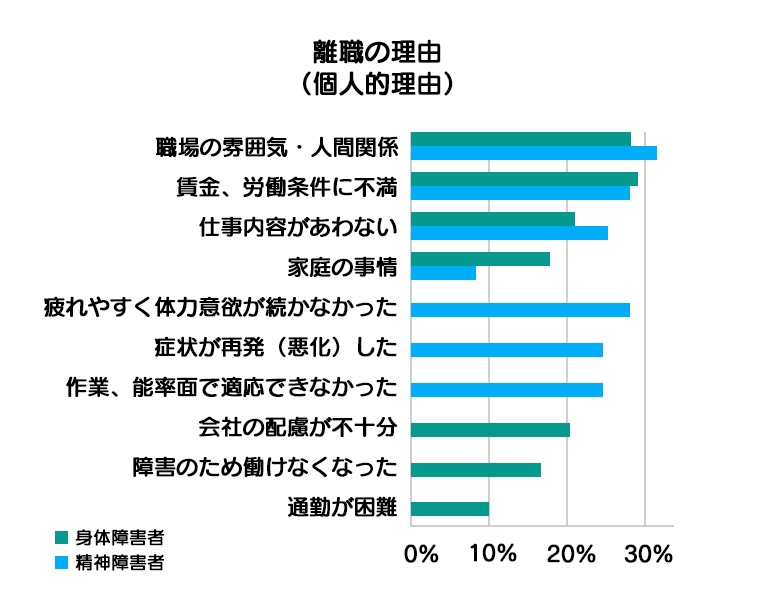 人間関係に不満を抱える方が多いこと、十分な配慮が行き届いていないことが、障害者が働き続ける上での主な課題としてあがっています。